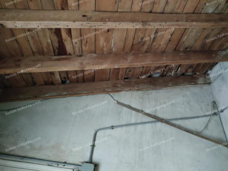 Je joins des photos, où on peut voir vers la gauche de la photo, les traces d'eau au niveau d'une des poutres au dessus des planches finalement. je précise qu'on voit une fuite dans le coin supérieur droit de la photo mais qu'il s'agit d'une autre sujet (même si je suis bien conscient qu'il faut que je règle ça avant de mettre une quelconque isolation en place ^^)